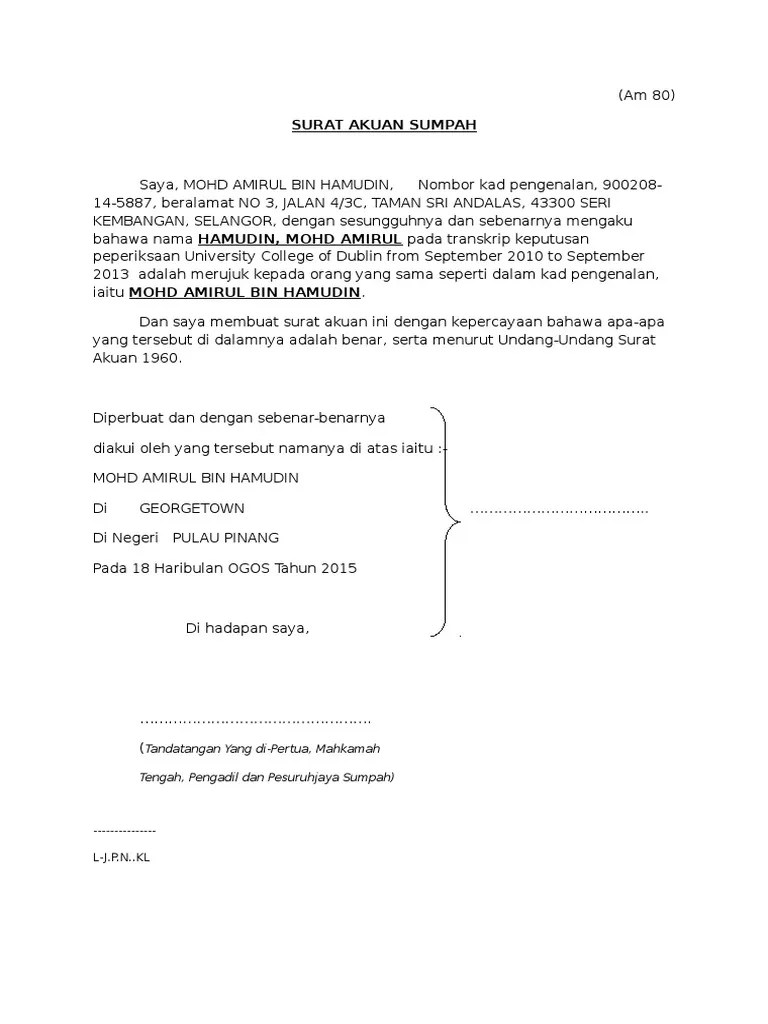 Asal dan 1 salinan surat akuan sumpah mengenai keterangan kemasukan ke . Mazliza abd razak surat akuan bujang. We are a sharing community. Pengesahan & pendaftaran di jabatan agama/majlis agama islam jika memeluk islam di luar negara (jika berkenaan) (asal . (jika anggota tentera) @ surat kebenaran pdrm (jika anggota polis).